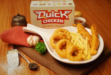 Semarakkan momen berkumpul Anda dengan kelezatan Quick Bucket yang terdiri dari onion rings, french fries dan chicken strip yang dilapisi oleh tepung khas Quick Chicken dengan cita rasa lokal tinggi.